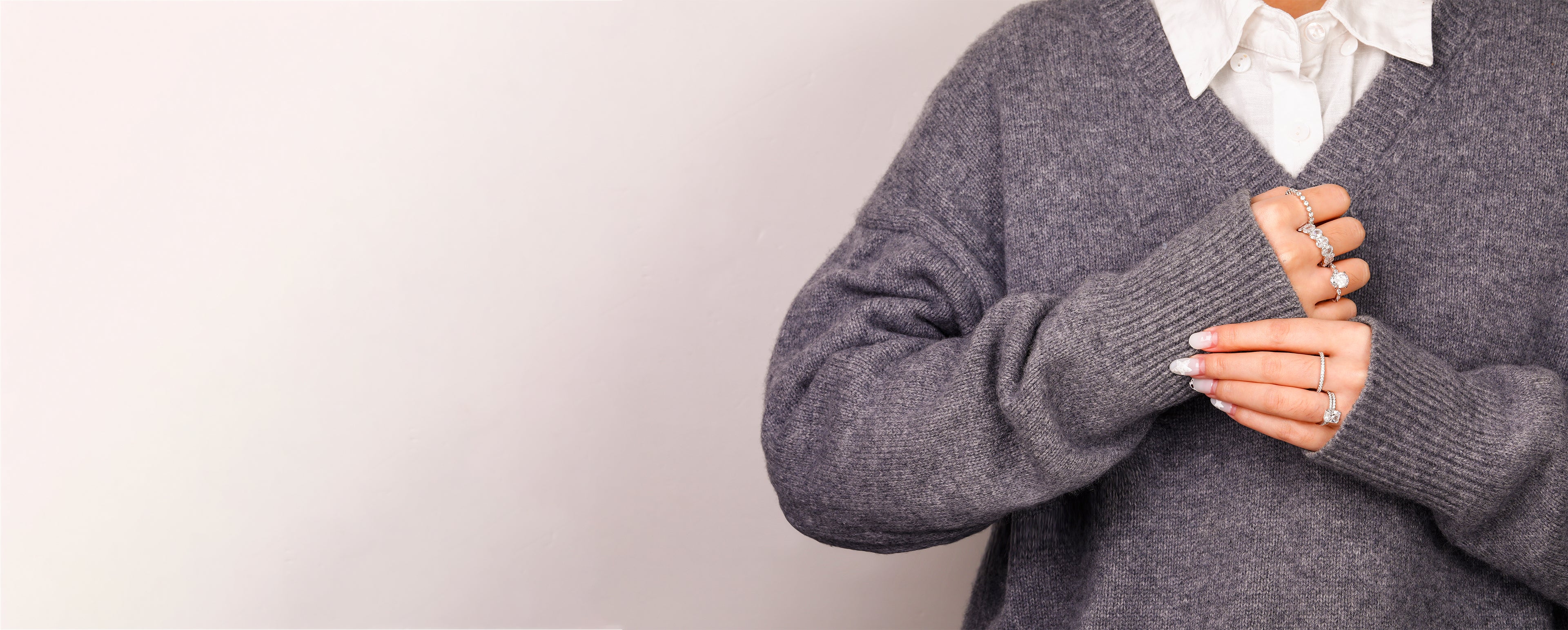 Three to five rings on each hand are ideal for achieving a balanced look. Over stacking can cause discomfort and visual clutter. However, every person’s body and style are different. If it doesn’t cause the rings to scratch one another in a damaging way, add the number of rings that feels right.