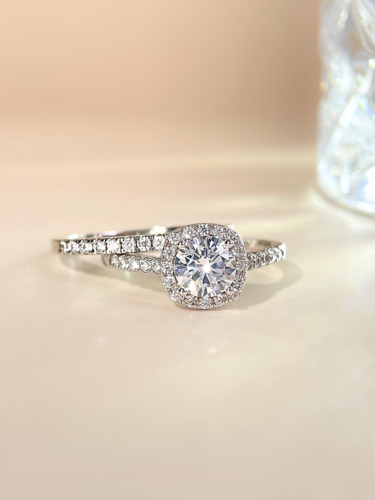 An engagement ring usually features a diamond or gemstone center and is given during a proposal. A wedding ring (or wedding band) is exchanged during the ceremony and is often simpler in design. An EAMTI bridal set combines both rings into a perfectly matched pair, designed to be worn together for a seamless, elegant look.